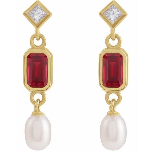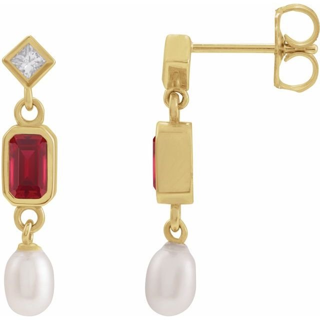 14k Yellow Lab-grown Ruby, Cultured White Akoya Pearl & .05 Ctw Natural Diamond Earrings